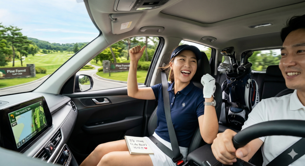 골프장에 가는 자동차 안….. 오늘은 왠지 라이프베스트를 칠 것 같은 기분이 듭니다.